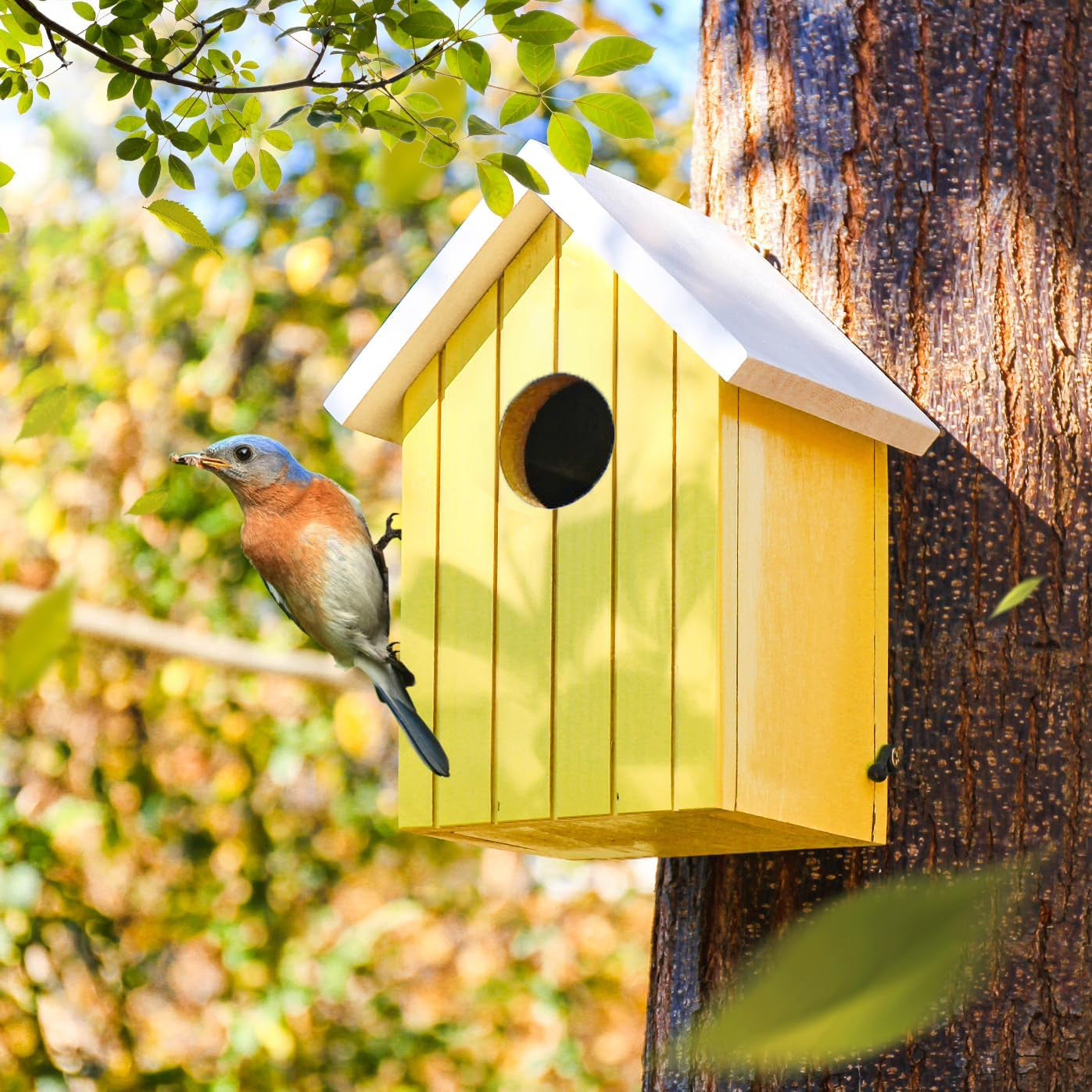 BirdShala exquisite birdhouse made of high-quality wood with a charming white roof. Crafted with precision and attention to detail, this birdhouse is not only a functional shelter for our feathered friends but also a delightful addition to any garden or backyard. The vibrant yellow color adds a touch of warmth and elegance, while the contrasting white roof adds a touch of sophistication. With its sturdy construction and weather-resistant materials, this birdhouse is built to withstand the elements and provide a safe haven for birds year-round. Bring nature closer to your home with this beautiful birdhouse that combines style and functionality effortlessly.